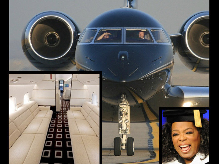 A apresentadora Oprah Winfrey viaja pelo mundo a bordo do seu próprio Bombardier Global Express XRS. O brinquedo, que custou quase R$ 137 milhões, tem poltronas de couro para 13 pessoas, banheiro com acabamento em mármore e sala de reunião